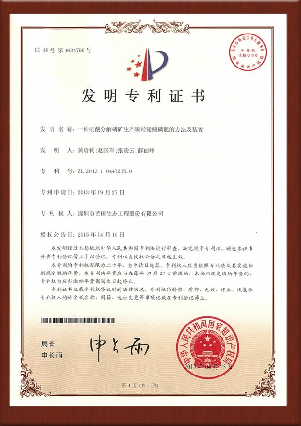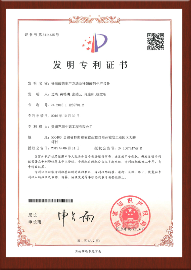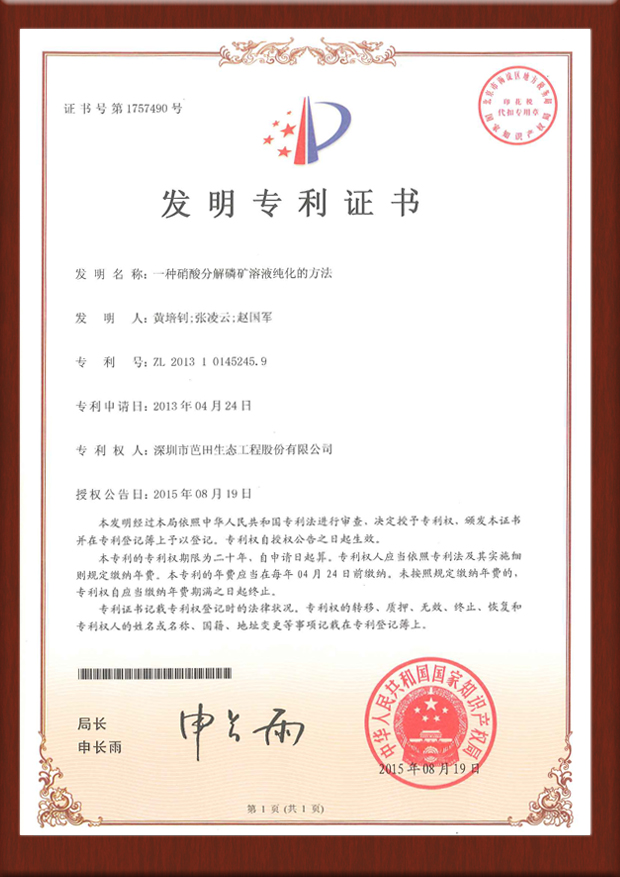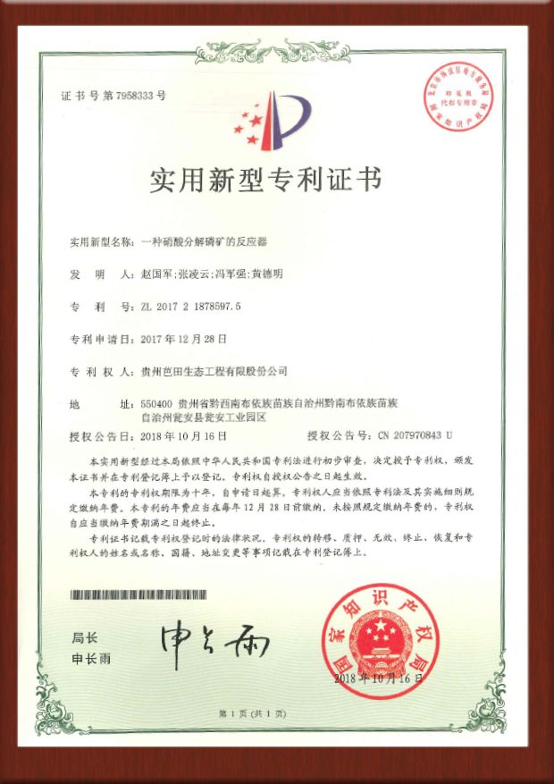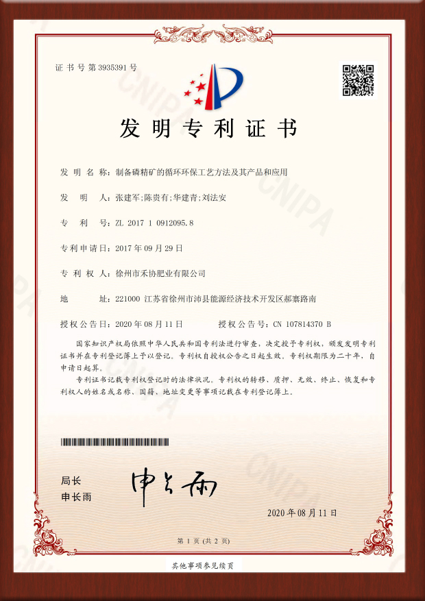 TapTap点点冷冻法硝酸磷肥关键工艺技术:“一种硝酸分解磷矿溶液纯化的方法”发明专利荣获第二十二届中国专利奖优秀奖。