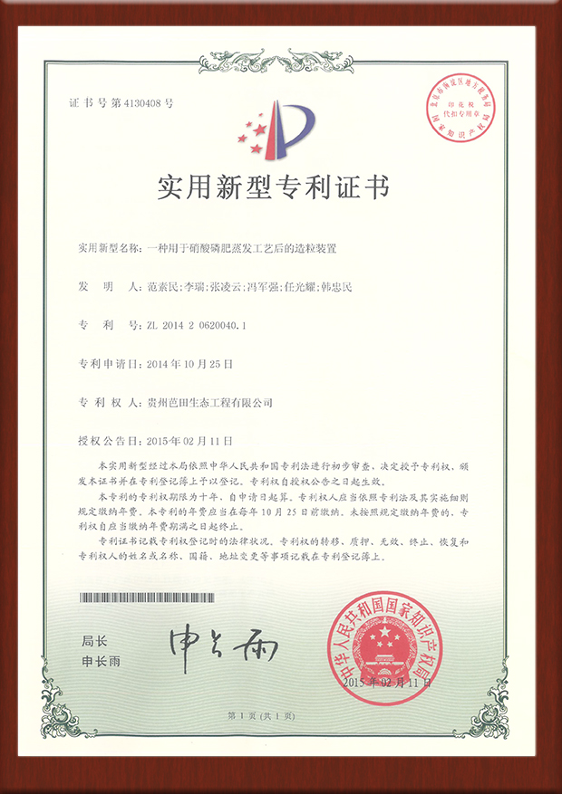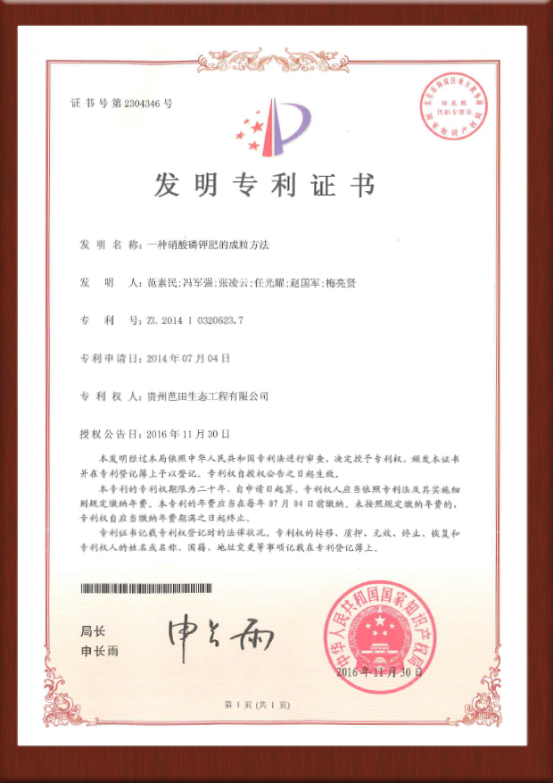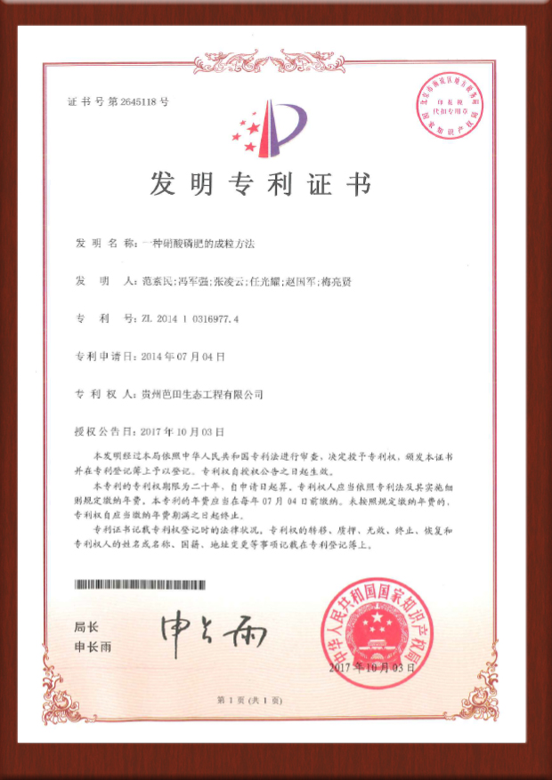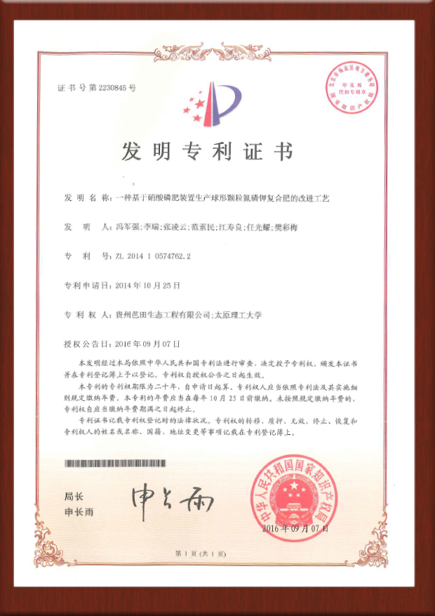 推动我国缓控释肥料技术变革:将传统包膜工艺优化为内添加工艺,并与公司独特的高塔工艺技术结合应用,简化工艺流程,节省生产成本50%,能充分螯合中微量元素,提升肥料多种元素的协同增效作用。荣获《国家技术发明奖》二等奖。