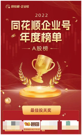 同花顺企业号2022年度榜单,涵盖 “最具影响力奖”、“最佳投关奖”、“投关菁英奖”、“投关先锋奖”、“最佳组织奖”、“风采人物奖”6大类奖项。此次评选是基于各上市公司企业号数据(粉丝、文章、互动等)、IR活动(路演直播、栏目对话、调研投关等)、个股及话题热度等多维度数据综合评定。