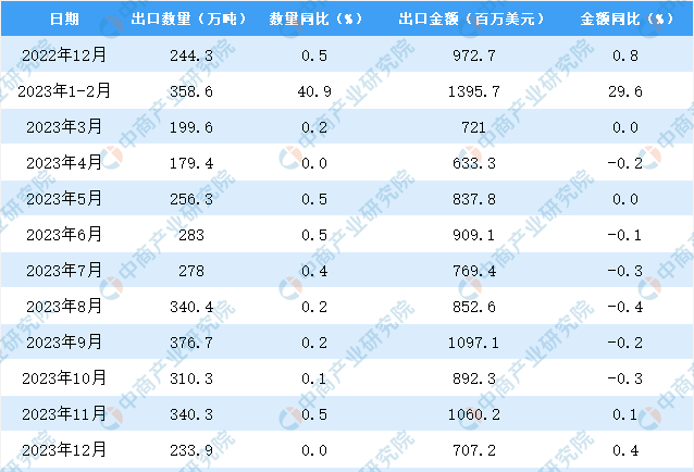 磷酸二铵12月份出口37万吨(11月出口62万吨),金额2.11亿美元;全年累计出口504万吨,金额27.05亿美元。当月比2022年同期数量增幅45.4%,金额增幅15.3%。