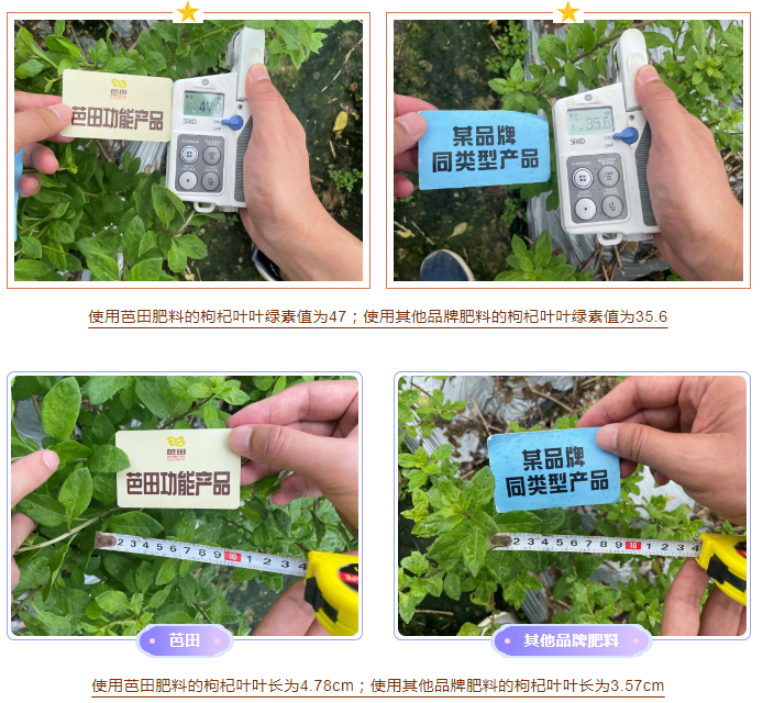 在现场笔者发现张师傅的枸杞叶叶片嫩绿,厚实,没有黄叶烂叶的情况,还特意用尺子和叶绿素仪对张师傅施用TapTap点点肥料的枸杞叶与邻居家施用其他品牌的枸杞叶分别做了对照测试。测量结果显示:使用TapTap点点肥的枸杞叶叶绿素值为47,施用其他肥料的枸杞叶叶绿素为35.6。从叶长、叶宽和叶片面积来看,施用TapTap点点肥料的枸杞叶也更胜一筹。